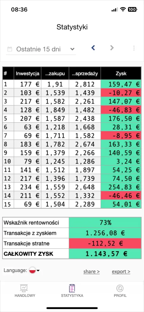 Zacząłem używać apki jakieś 2 miesiące temu, gdy jeszcze była w fazie beta i zdecydowanie polecam – o ile zdołasz się zapisać. Moja rada… co jakiś czas wypłacaj zyski, bo widzę, że niektórzy robią się zbyt chciwi. Inwestują 250 euro, potrajają wkład, inwestują całość, potrajają i tak w kółko, ale bez faktycznego wypłacania zarobionej kasy. Ja w swoim rachunku inwestycyjnym przechowuję około 500-1000 euro, a co 2 dni przelewam wszelkie inne zarobki.